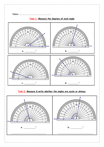 Grade 6 Math Worksheets Grade 6 Math Worksheets. Grade 6 is where we really start to do actual algebra. Not only solving for x, but using variables in the form of an expression. ... Their geometry skills are ready to be heightened, but they know their way around a protractor. They should also be able to sort geometric shapes and be able to classify triangles ... Browse Printable 4th Grade Math Worksheets | Education.com Put that protractor to good use! In this geometry worksheet your student will practice measuring each of these angles using a protractor. 4th grade. Math. ... Our printable fourth grade math worksheets help them through this challenging process with an array of educational (but fun) exercises. From mixed word problems to partial quotient ... Middle School Math Worksheets This collection contains math resources on supplementary and complimentary angles. Angle Types & Measurement. Learn about acute, obtuse, and right angles. Use a protractor to measure angles. Area of Circles. Given the radius or diameter, find the areas of the circles. Area of Trapezoids and Parallelograms How to Use a Protractor worksheet - Liveworksheets.com ID: 300590 Language: English School subject: LEAD- ELL- ESL Grade/level: high school Age: 14-18 Main content: Math- geometry Other contents: language; vocabulary; measurement Add to my workbooks (26) Download file pdf Embed in my website or blog Add to Google Classroom